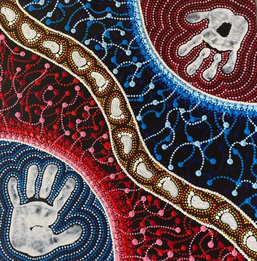 This piece represents the connection between siblings, the hand prints of my 2 eldest daughters, the red representing their connection as family, the blue representing their connection as friends. The foot prints representing their journey through life together.
